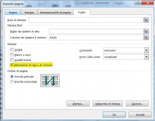 Selezionate la casella di opzione Stampa sotto la voce Intestazioni per stampare le intestazioni di riga e di colonna in ogni pagina