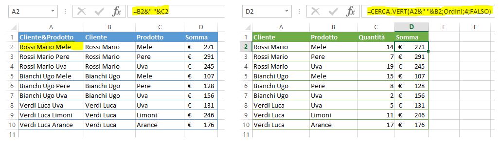 =CERCA.VERT(A2&" "&B2;Ordini!$A$2:$D$10;4;FALSO)